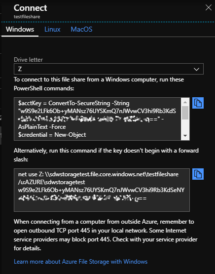• Configured File Share on Storage Account