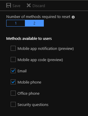 You can also configure various required authentication methods and enforce the number of methods required before allowing a reset.
