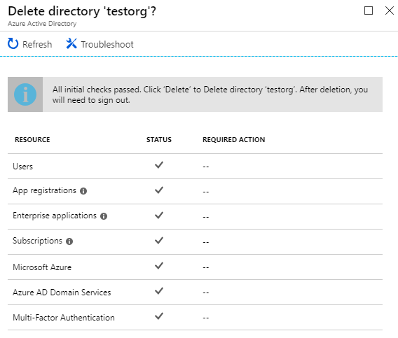 - Azure will now perform various checks and inform you whether you can delete the tenant or if you’re required to perform further actions. Some checks will require a refresh of the browser window before they will pass if they’ve previously failed.