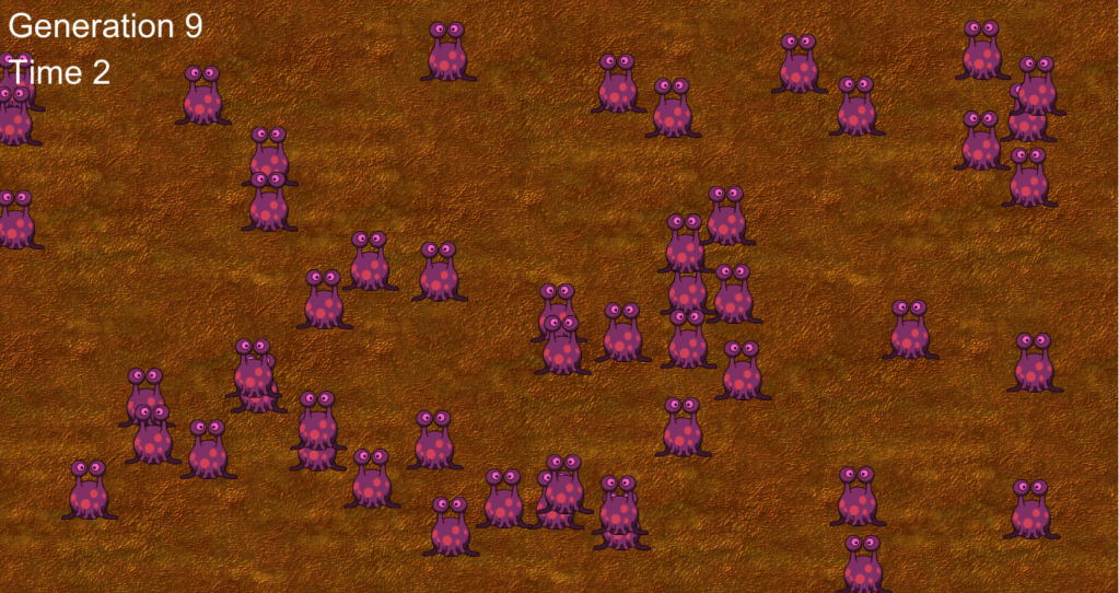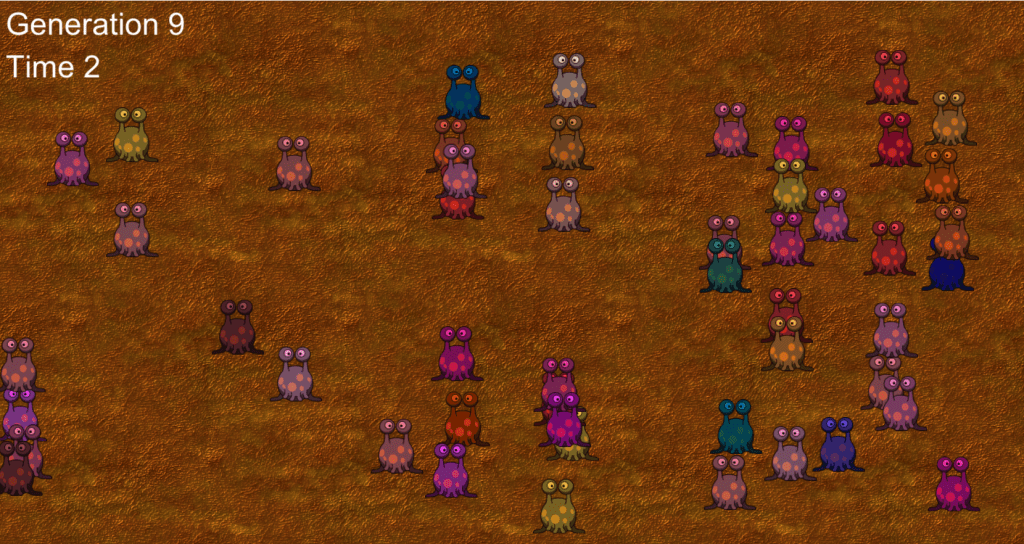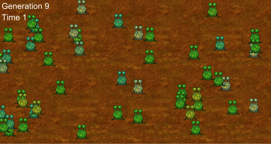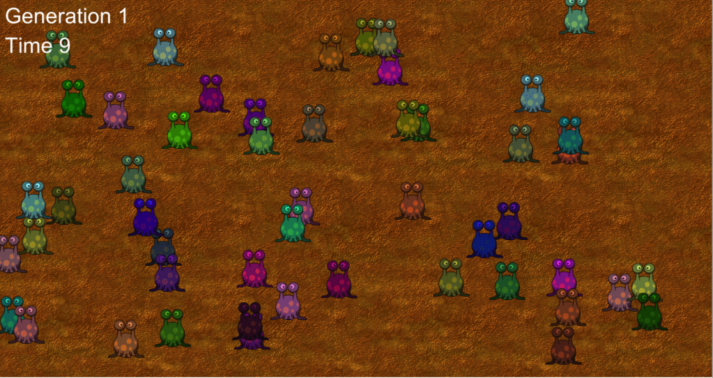 Generation 1 – Showing randomly colored aliens due to randomly chosen genetics