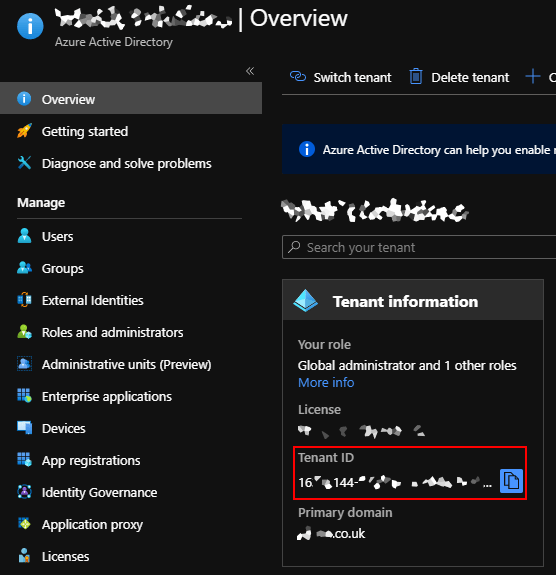3. In the Overview panel, copy the Tenant ID shown in the Tenant information box as shown below –