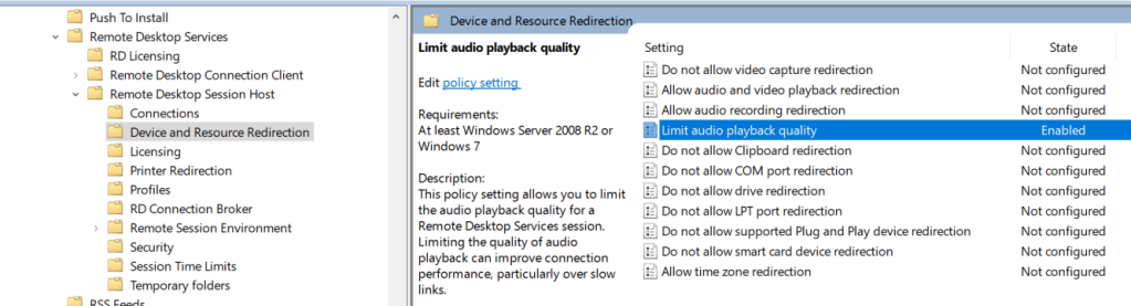 - Computer Configuration > Administrative Templates > Windows Components > Remote Desktop Services > Remote Desktop Session Host > Device and Resource Redirection.