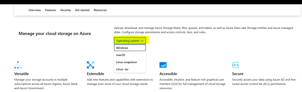 - To install storage explorer, go to Azure Storage Explorer – cloud storage management | Microsoft Azure and download the app, use the drop-down to select your operating system and click to download