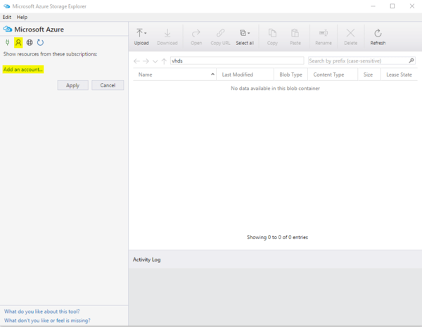 - Click on Add an Account to connect to your Subscription and respective Storage Accounts.