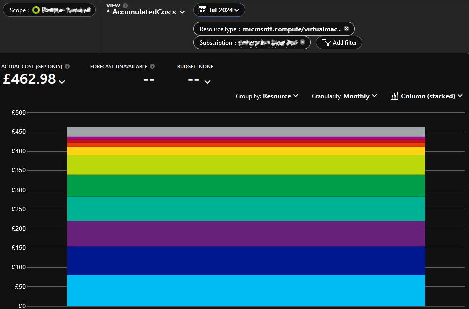For a straightforward way to identify your most expensive VMs, adjust the time filter to “Last Month,” set the Resource Type to “microsoft.compute/virtualmachines,” group by “Resource,” set Granularity to “Monthly,” and change the chart type to “Column (stacked).” You can then export this view as a CSV file, allowing you to easily sort and analyze the data.