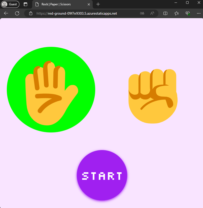 https://<your-app-name>.azurestaticapps.net. Click this link to visit your live site! - Clicking the Start button starts a very basic AI vs AI game of Rock, Paper, Scissors.