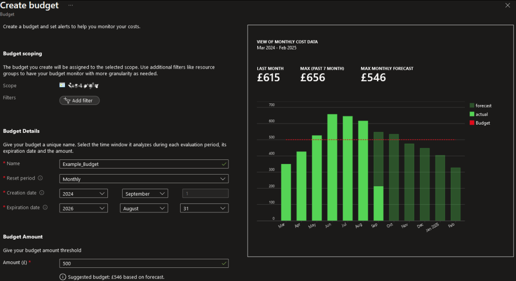 - Create Budgets: Set budgets at various levels—subscription, resource group, service type or various other scopes. This helps you segment costs and prevent any one department or service from overspending.